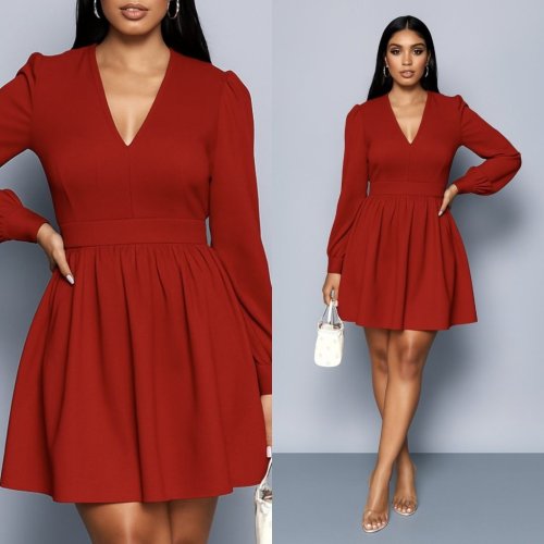 • Kadın uzun kollu V yaka belden hafif pileli scuba krep mini boy elbise