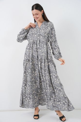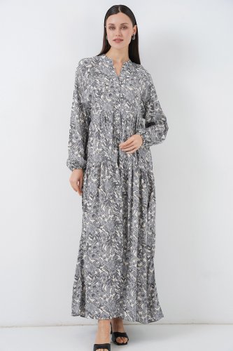 • Desenli Uzun Tesettür Elbise 2585 Gri